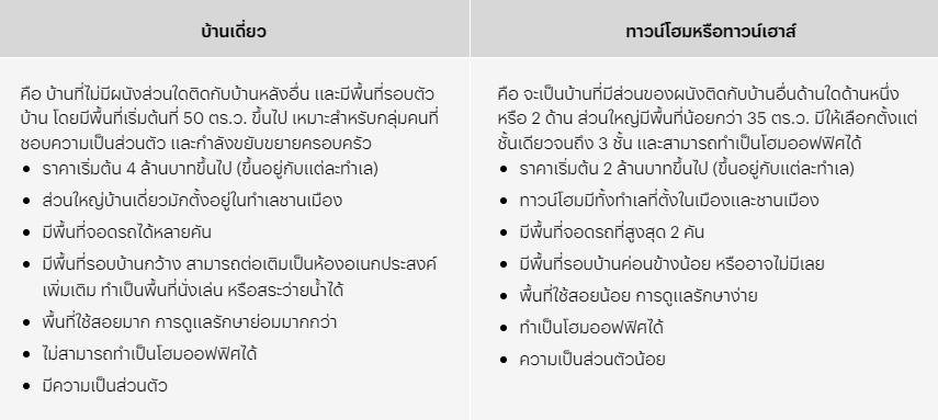 สมัยนี้คิดจะขยับขยายรากฐานชีวิตตัวเองด้วยการซื้อบ้านหลังแรกสักหลัง อาจจะต้องคิดพิจารณาเยอะสักหน่อย ไม่ว่าจะปัจจัยเรื่องเงิน ทำเล หรือแม้แต่ความคุ้มค่า ยิ่งในยุคที่โลกกำลังเผชิญโรคระบาดเช่นนี้ด้วยแล้ว มนุษย์เงินเดือนที่หวังพึ่งเงินก้อนทุกสิ้นเดือน จะซื้อบ้านทั้งทีคงต้องเอาให้คุ้ม ทั้งคำนึงถึงความปลอดภัย คุณภาพชีวิต และความเป็นอยู่สบายในอนาคตของครอบครัวเป็นหลัก เหตุนี้เองจึงทำให้ระดับความนิยมการซื้อบ้านทาวน์โฮมกับบ้านเดี่ยวที่ผ่านมา ผู้พัฒนาโครงการอสังหาฯ ต่างได้ผลตอบรับค่อนข้างดีเกินคาด สวนกระแสภาวะเศรษฐกิจถดถอย แถมยังออกแคมเปญโปรโมชันแบบจัดเต็มอย่างที่ไม่เคยมีมาก่อน ด้วยเหตุนี้เองจึงทำให้มนุษย์เงินเดือนหลายคนอาจคิดไม่ตก เลือกไม่ถูกว่าจะซื้อบ้านเดี่ยวหรือทาวน์โฮมดี ลองมาดูความแตกต่างระหว่างทาวน์โฮมกับบ้านเดี่ยว เพื่อช่วยให้คุณเข้าใจและตัดสินใจได้ง่ายขึ้น
